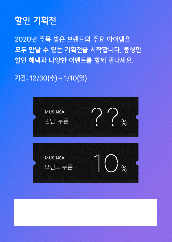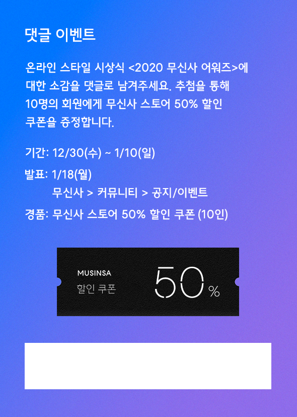 추첨을 통해 10명의 회원에게 무신사 스토어 50% 쿠폰을 증정합니다.